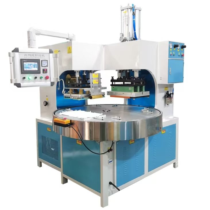 本機設計C型式雙頭四工位自動轉盤式結構,分割器+電機精度旋轉,PLC人機界面+金電系統實現人工擺料_高周焊接_熔斷裁切_人工取件循環步驟,搭載高靈敏5557火花保護,自動過流保護及相序保護,風壓保護等安全操作系統,滿足于產品需求輔助加熱且熔斷需求冷切工藝.功率大小及轉盤直接可定制.
